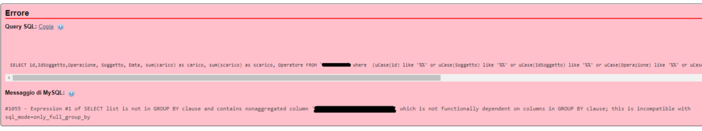 SELECT ANY_VALUE(IdSoggetto), sum(carico) as carico, sum(scarico) as scarico, FROM tabella where (uCase(id) like ‘%xxx%’ or uCase(Soggetto) like ‘%xxx%’ or uCase(IdSoggetto)like ‘%xxx%’) and IdSoggetto=’2′ group by Soggetto, data, Operatore order by Soggetto,Data