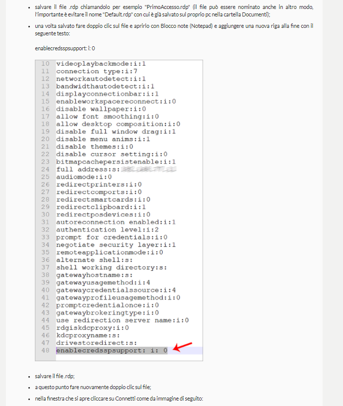 – alla fine del file aggiungere la riga: enablecredsspsupport: i:0